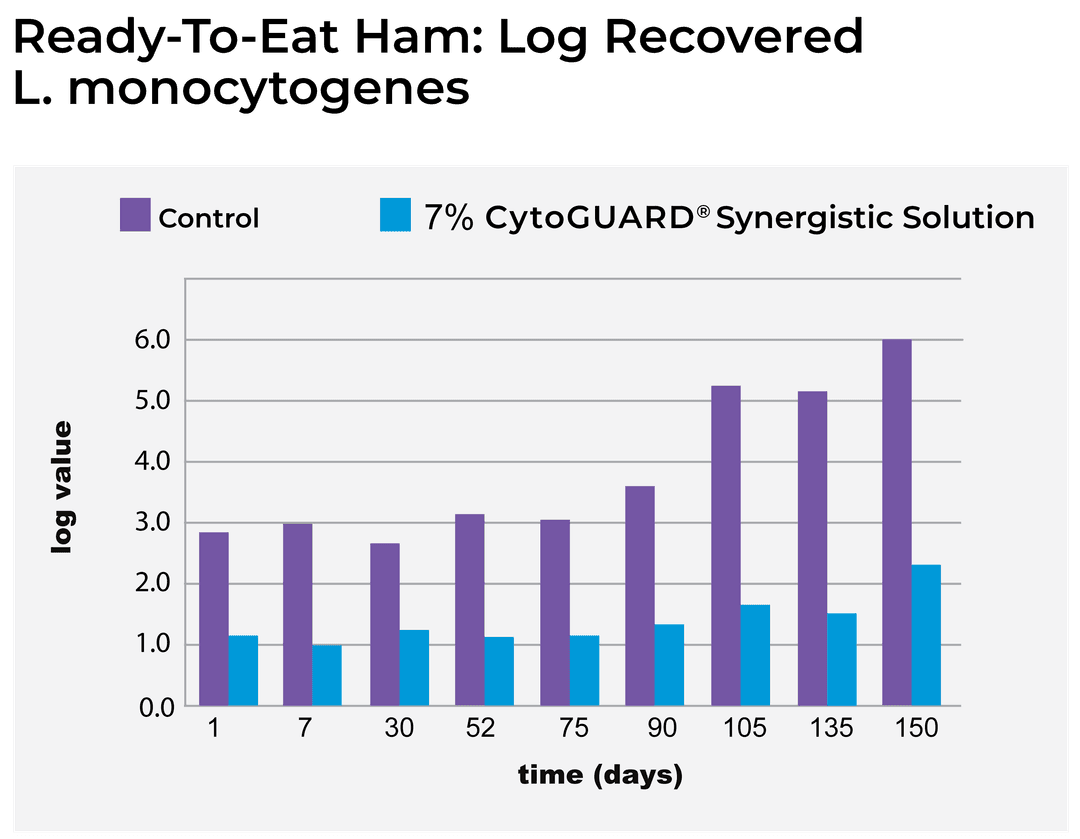 When applied as a surface treatment, CytoGUARD® targets the primary location of bacterial growth, maximizing the preservation effect while minimizing any impact on sensory qualities when used at recommended usage rates. In this study, bactericidal and bacteriostatic solutions were combined to achieve a maximum shelf life extension of 150 days in deli ham products.