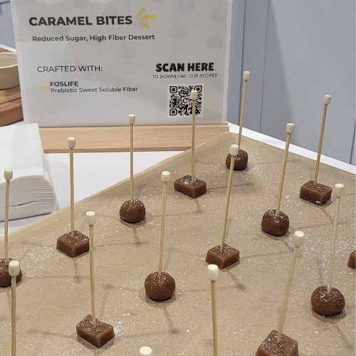 At the event, we showcased high-fiber caramels formulated using FOSLIFE® prebiotic soluble fiber syrup, demonstrating its versatility in reducing sugar content without compromising taste or texture.