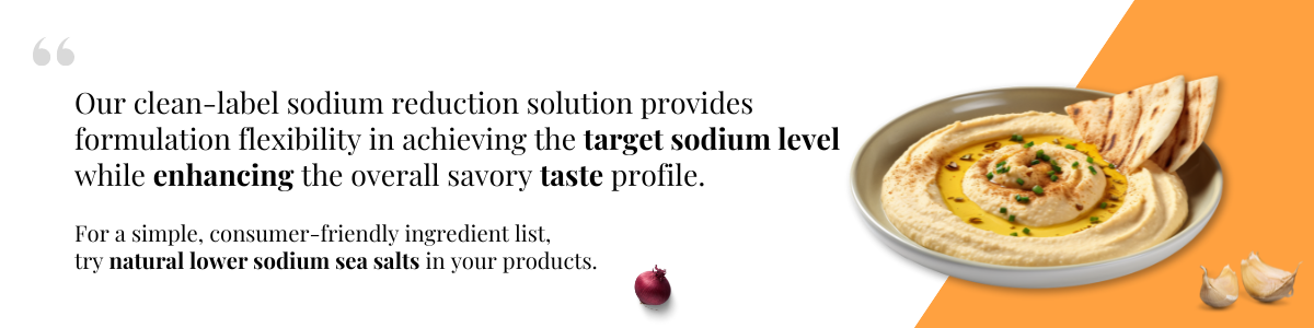 Our chef team set out to develop a clean-label sodium-reduced hummus by replacing sodium chloride with a natural lower sodium sea salt. They wanted to achieve a 25% sodium reduction while maintaining the taste, meeting the clean-label requirements, and extending shelf life.