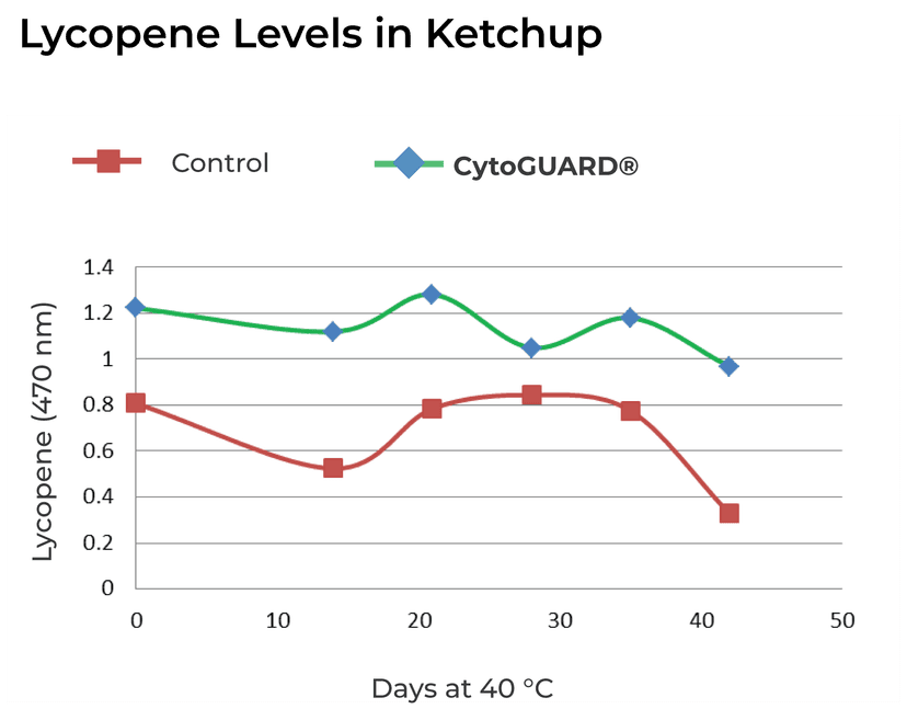Ketchup darkens over time from air exposure. The browning is a result of the oxidative degradation of the tomato Lycopene. This study has demonstrated that CytoGUARD® natural antioxidants can effectively reduce oxidation of Lycopene in ketchup, minimizing the browning effect in the products over 40 days.