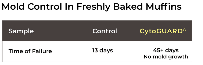 CytoGUARD® significantly extended the shelf life of freshly baked muffins by inhibiting mold growth without affecting the color, flavor, or texture when used at the recommended usage rates. In this study, no mold growth was observed for an additional four weeks compared to the control sample, which contained no preservatives.