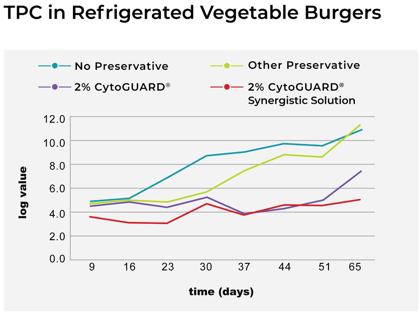 Meat and plant-based alternatives are known for their high perishability and vulnerability to pathogen contamination. In this study, we explored the effectiveness of combining CytoGUARD® bactericidal and bacteriostatic solutions to enhance product safety and longevity. Following the initial bacterial treatment, we successfully extended the shelf life of vegetable burgers by over 65 days, demonstrating the powerful impact of these preservation techniques in maintaining product quality and safety.