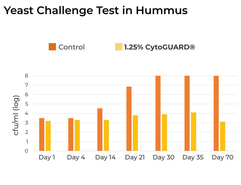 CytoGUARD® natural extracts have demonstrated effective yeast and mold control in refrigerated foods and other products. In this study, CytoGUARD® extended the shelf life of refrigerated hummus up to 70 days restricting yeast growth compared to the control sample which had uncountable yeast colonies by Day 30.